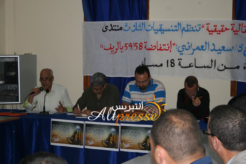 تحت شعار” من اجل اعمال مبدأ معرفة الحقيقة.. مدخل أساسي لتحقيق عدالة انتقالية حقيقية”، نظمت يوم السبت 31 ماي 2014 ابتداء من الساعة السادسة مساء (18:00) بالمركب الثقافي والرياضي بالحسيمة التنسيقيات الثلاث لمنتدى حقوق الانسان لشمال المغرب بالحسيمة ( الحسيمة، امزورن، ايث بوعياش) لقاءا لتوقيع كتاب انتفاضة 58/59 بالريف كما رواها لي أبي للأستاذ سعيد العمراني.