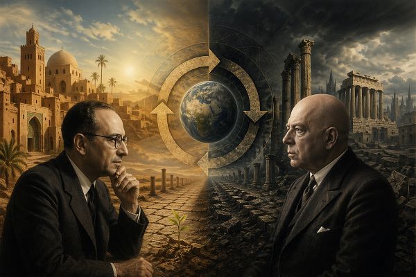 إنَّ دراسة الدَّورة الحضارية عند بن نبي وشبنغلر تكشف عن رؤيتَيْن للعالَم: رؤية تؤمن بإمكانية التغيير والإصلاح، وأُخرى ترى التاريخَ قَدَرًا لا مَفَرَّ مِنْه. وبين هاتَيْن الرؤيتَيْن، يقف الإنسانُ المعاصر أمام سؤال جوهري: هل نحن صانعو حضارتنا أمْ أسْرَى مَسارها؟. رُبَّما تكون الإجابة في الجمع بين الوعي بقوانين التاريخ، والإيمانِ بقدرة الإنسان على تجاوزها، وهو ما يَجعل من دراسة الحضارة لَيس مُجرَّد تأمُّل في الماضي، وإنما مشروع لصناعة المستقبل.