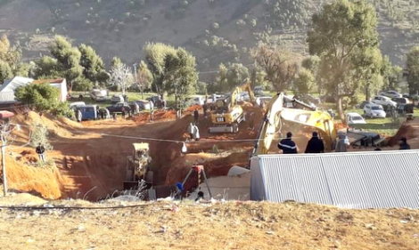 تواصل مختلف الجرافات والآليات أشغال الحفر لانتشال الطفل ريان البالغ من العمر 5 سنوات، العالق في ثقب مائي بالقرب من منزل أسرته بمركز تامروت بإقليم شفشاون، وذلك لليوم الثالث على التوالي بعد سقوطه في البئر منذ زوال يوم الثلاثاء الماضي. وعادت آليات الحفر لاستئناف أشغالها بعد توقف اضطراري نتيجة انهيار صخري بمحاذاة الحفرة التي يوجد فيها ريان على عمق يتجاوز 30 مترا تحت الأرض، في وقت يتتبع فيه طبوغرافيون وخبراء العملية بحذر من أجل إنجاح سيناريو الإنقاذ في أسرع وقت ممكن وبدون إلحاق أي أذى بالطفل العالق. ويعرف مركز تمروت، حالة ترقب واسعة من قبل مئات المواطنين المتجمهرين بالقرب من البئر منذ أول أمس الأربعاء، في حين عززت المصالح الأمنية من وجودها لمنع الاقتراب من مكان الأشغال والبئر الذي شهد هذه الحادثة. وكانت الكاميرا التي تستعين بها مصالح الوقاية المدنية لمراقبة الوضع داخل الثقب المائي الذي يوجد به ريان منذ أول أمس الثلاثاء، وثقت لقطات جديدة تؤكد بأن الطفل العالق لا يزال على قيد الحياة. وأظهر الفيديو، قيام الطفل العالق بمحاولات للنهوض من مكانه، وتعرضه بين الفينة والأخرى لفقدان وعي مؤقت قبل أن يستيقظ من جديد. ويقوم فريق الإنقاذ بإنزال أنبوبي ماء وأوكسجين، لتزويد الطفل بهاتين المادتين الحيويتين لإطالة صموده في انتظار انتشاله على قيد الحياة